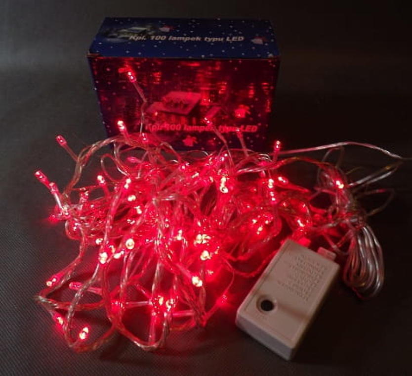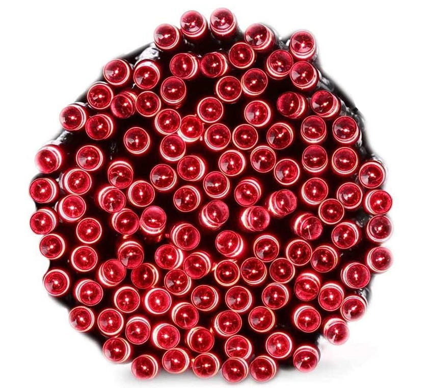 Komplet 100 Czerwonych Lampek Choinkowych LED z Programatorem 8 Funkcji, Zastosowanie Wewnętrzne i Zewnętrzne, Europejskie Standardy Bezpieczeństwa, IP44, Długość 5m, Zasilanie 230~50Hz max 3.6w.