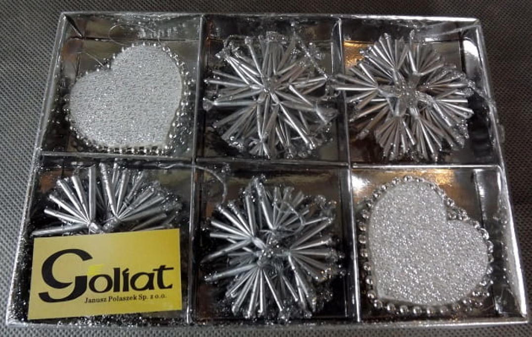 Kpl. 18 zawieszek ze słomy.Kolor srebrny w srebrnym kartoniku.Wielkość:19x13cm